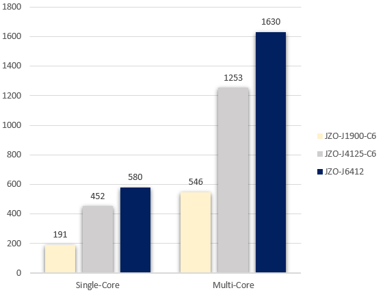 위의 그래프는 J1900, J4125, J6412 세 가지 모델의 CPU 점수를 비교한 그래프입니다.