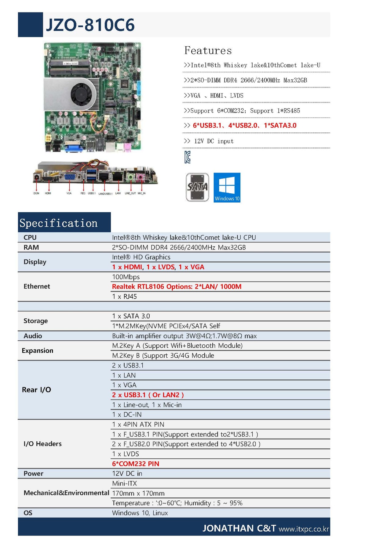 | Mechanical&Environmental | Mini-ITX (170mm x 170mm) Temperature : ':0~60℃; Humidity : 5 ~ 95% |