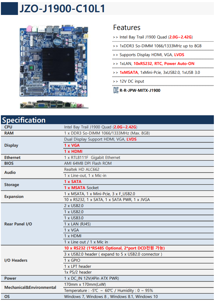 안녕하세요 늦은 가을 비가 내리며 날씨가 부쩍 쌀쌀해졌네요~ 모두들 옷을 따뜻하게 입으시고 감기 조심하시길 바랍니다~ 오늘 소개해드릴 제품은 "JZO-J1900-C6"라는 보드입니다~! Celeron