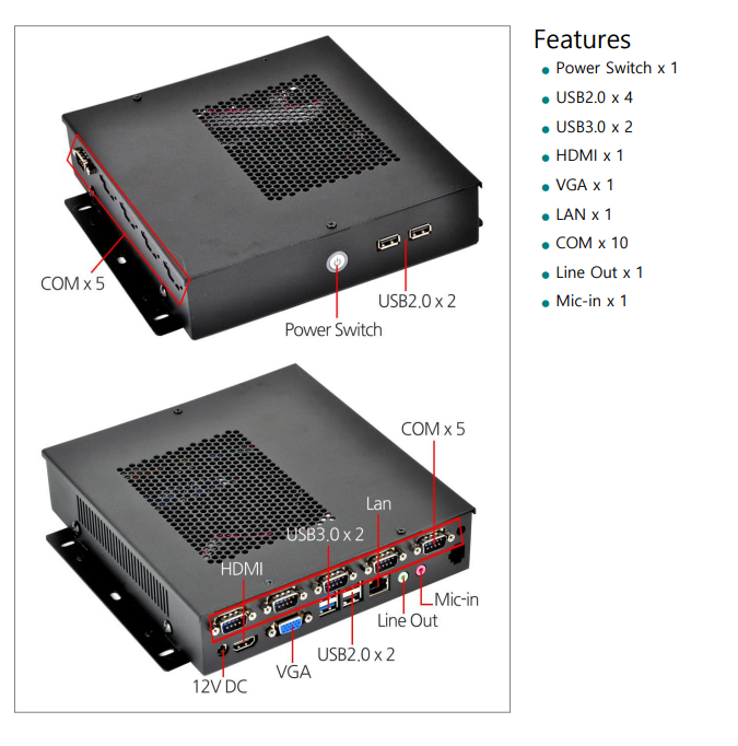 후면은 12V DC, HDMI, VGA, USB 3.0*2, USB 2.0*2, LAN*1, Mic-in, Line-out, COM*5,