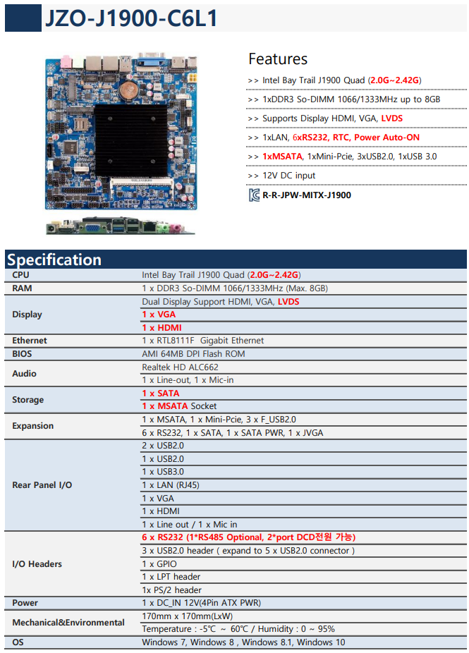 Window 7이 호환되는 산업용 보드 "JZO-J1900-C6"