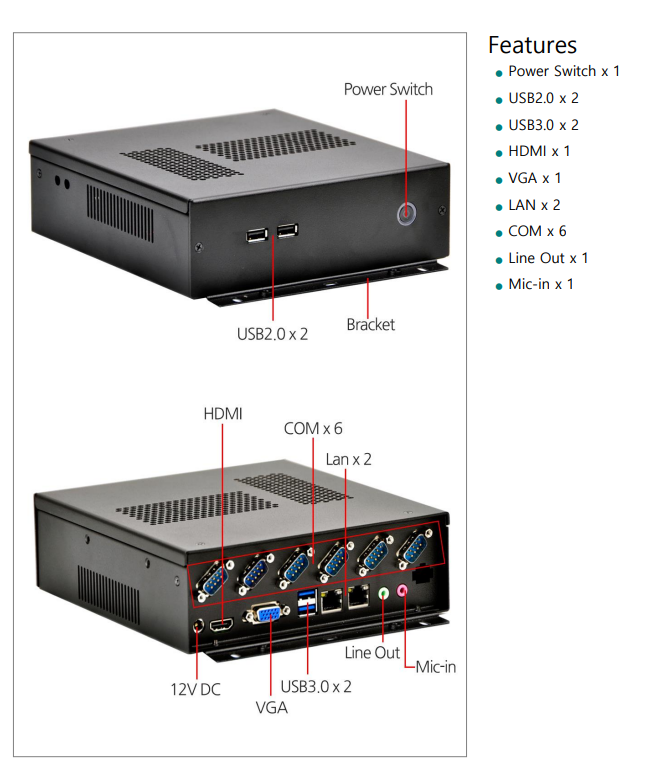 후면부는 COM*6, 12V DC, HDMI, VGA, USB 3.0*2, LAN*2, Line-out, Mic-in 으로 구성되어있습니다.