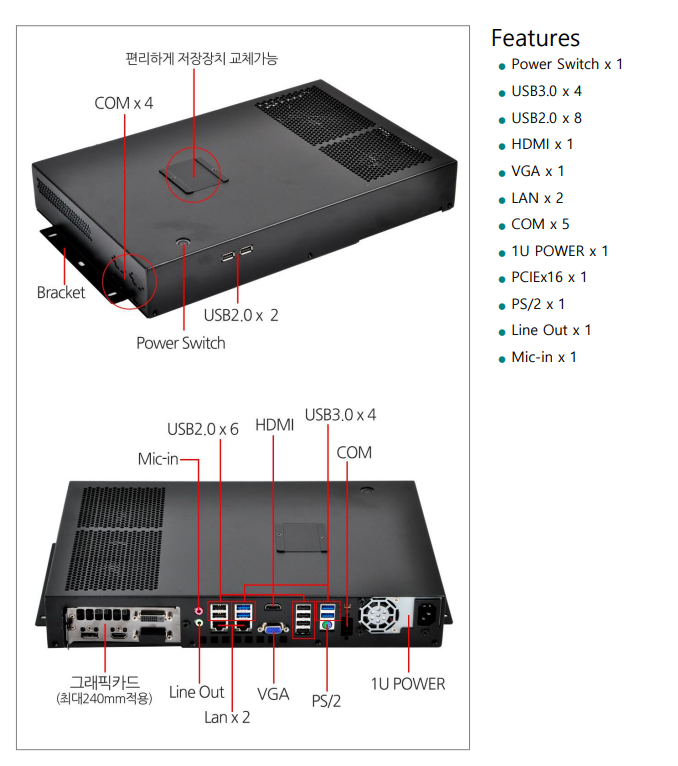 1* PS/2, USB 3.0*4, USB 2.0*6, VGA, HDMI, LAN*2, Line-out, Mic-in, 으로 구성되어있습니다.
