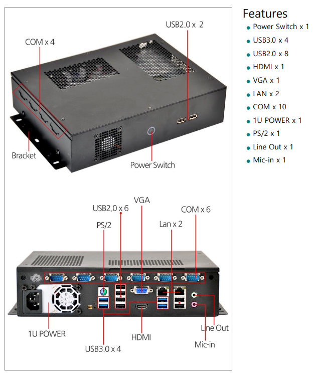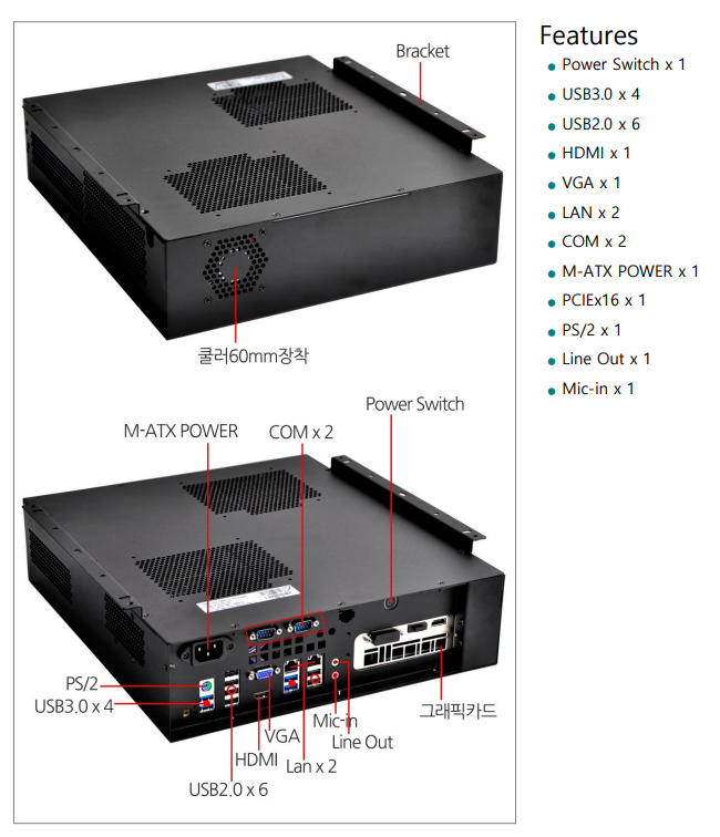 1* PS/2, USB 3.0*4, USB 2.0*6, VGA, HDMI, LAN*2, Line-out, Mic-in, 으로 구성되어있습니다.