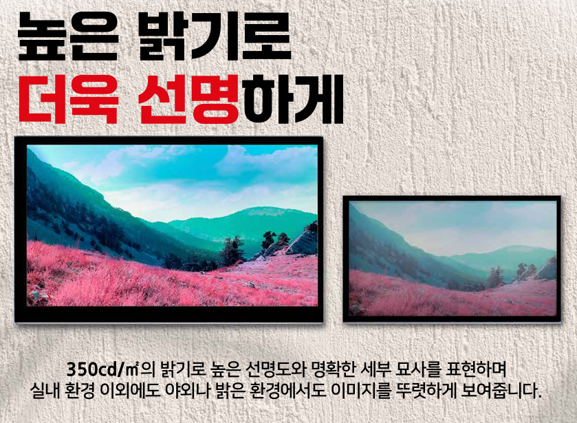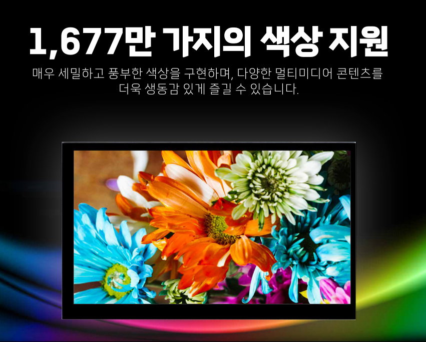 실내뿐 아니라 주변 조도가 높은 환경에서도 화면이 뚜렷하게 표현되며, 1,677만 가지 색상(24bit)을 지원해 생생한 색감 구현이 가능합니다.