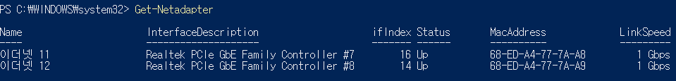 확인 방법은 위 명령어 창에 다시한번 Get-NetAdapter을 입력해주세요.