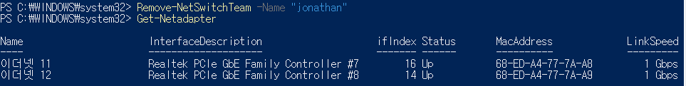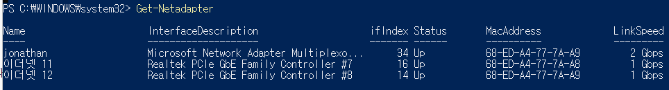 동일하게 Get-Netadapter을 검색하시면 jonathan이 잡힌게 보이시죠?