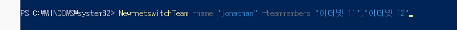 New-NetSwitchTeam (띄고) -name (띄고) "jonathan"(띄고) -TeamMembers (띄고) "이더넷 (띄고) 11","이더넷 (띄고) 12"