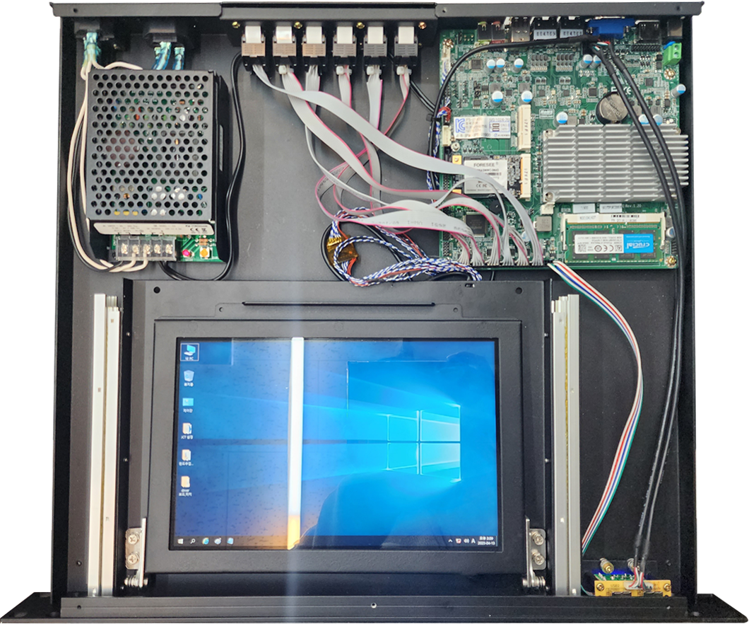안녕하세요.오늘은 1U (높이 44.4mm) 10인치 터치모니터가 힌지와 슬라이드로 내장되어 있어,평상시에는 1U RACK 처럼 사용하시다가, 모니터가 필요할 때, 빼서 사용 할 수 있게 제작한 제품입니다. 제품사진을 보면서 설명드리도록 하겠습니다.제품 내부 사진입니다.사진과 같이, 내부에 10인치 터치모니터가 내장되어 있으며, 모니터 사용시 아래의 사진처럼 사용 가능합니다. 내부 구성은 220V 전원을 인가하여, SMPS로 보드와 모니터에 전원을 인가할 수 있도록설계하였으며, 보드의 경우는 ITX 보드 원하시는 보드의 스펙에 따라 변동가능합니다.추가로 필요한 포트들이 있다면, 후면부에 설계,변경하여 추가 타공 가능합니다. 전면부는 1U 사이즈로 슬림한 사이즈로 제작하였으며, RACK 서버에 장착 가능..